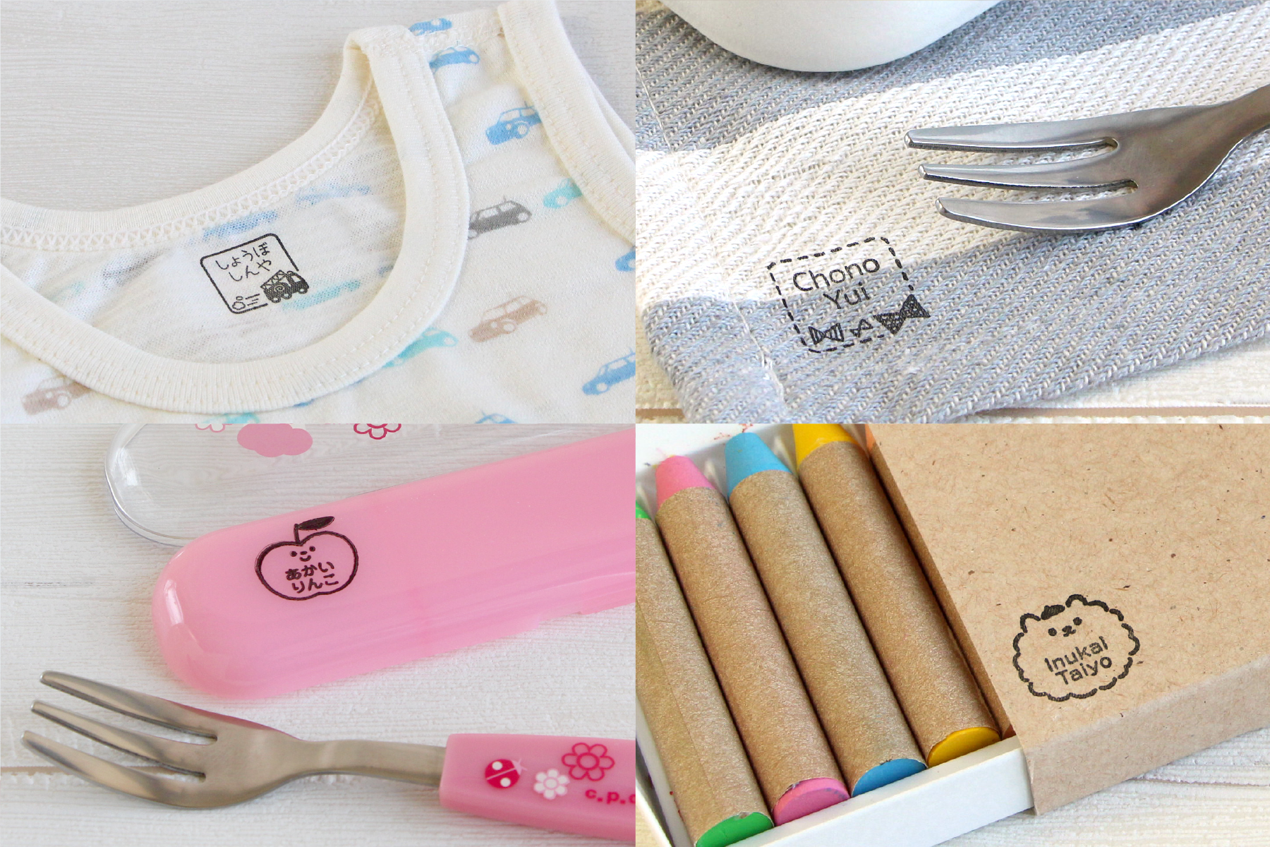 洗濯タグが付いていないランチョンマットやコップ袋、マスク、靴下などにも名前つけが可能です。文具や食器にも使用でき、食洗機にも対応しているため、このスタンプ1本で入園・入学準備の名前つけをまとめて行えます。