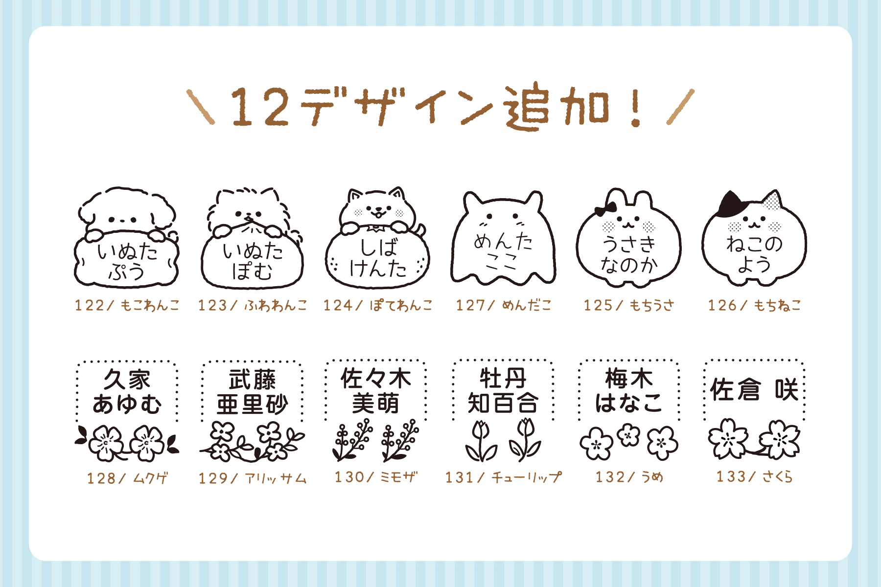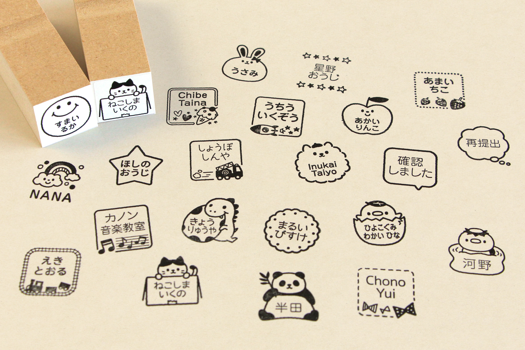 めんだこ・うさぎ・ねこモチーフを丸みのあるフォルムにして、名前が自然になじむスタンプに仕上げました。年齢や性別を問わず使いやすく、きょうだいでの使い分けにもおすすめです。