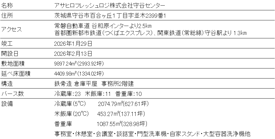 1,700台のトラックと2,700人超のドライバーで毎日500万人の食生活を支える物流インフラ企業、アサヒロジスティクス株式会社(埼玉県さいたま市大宮区/代表取締役社長 横塚 元樹)は、グループ会社であるアサヒフレッシュロジ株式会社(代表取締役社長:森 立郎)の茨城県守谷市における新たな物流拠点「守谷センター」が竣工し、2026年2月13日(金)に開所式を執り行うことをお知らせいたします。