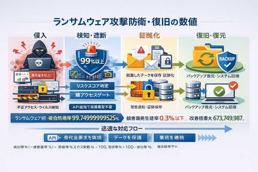 「ランサムウェア(暗号化・二重脅迫)」は端末攻撃(区分C)として整理され、複合導入後の指標として複合防衛率99.74999999525%、複合被害確率 0.25000000475%(≦0.3%)が示されています。