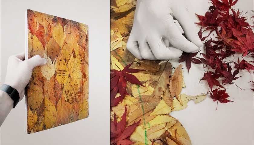 魚皮や牛骨などの素材アプローチを経て、現在は落ち葉を中心とした作品群(特許取得)を展開。