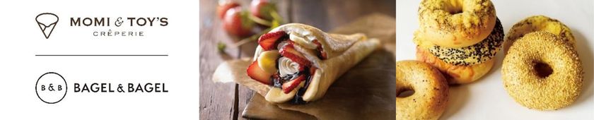 アーモンド粉を贅沢に使用した、ふんわりさくさくとした生地が特徴の“とろけるクレープ”「MOMI&TOY'S(モミアンドトイズ)」と“しっとりもちもち”ソフトな食感が特徴のベーグル専門店「BAGEL & BAGEL(ベーグル アンド ベーグル)」が楽しめる、両ブランドを併設した店舗です!
