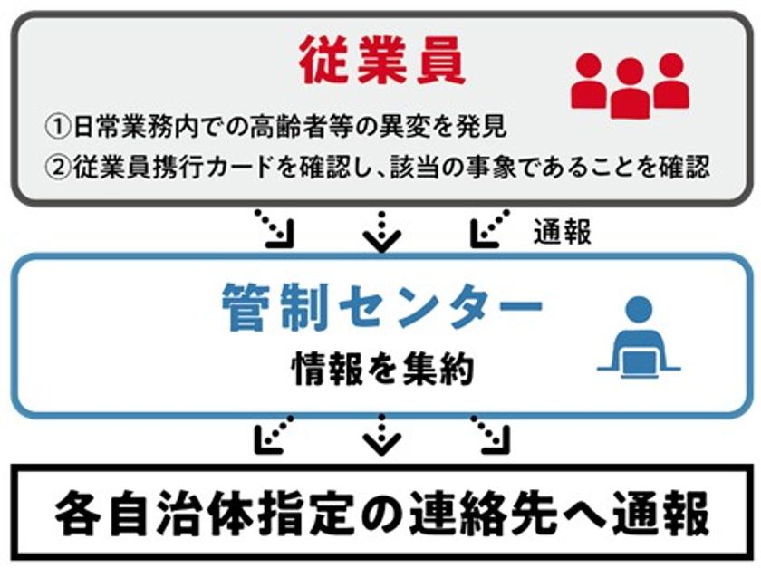 今回の取り組みは、自治体と連携し、高齢者の生活上の異変を早期発見することで、孤立防止や要援護者支援につなげることを目的としています。従業員が「郵便受けに新聞などが溜まっている」「認知症等による徘徊の可能性」など、緊急の対応が必要と判断される異変に気付いた場合は、事前に各自治体と取り決めた連絡先に速やかに通報します。