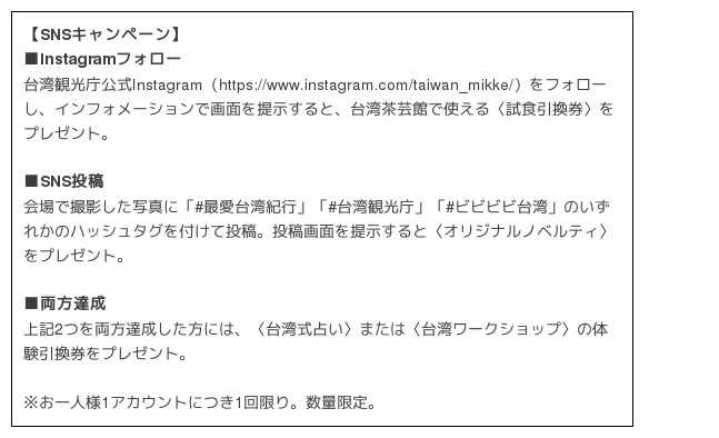 さらにもっと日本の皆様に、台湾の魅力を五感で体感頂きたいという思いから、昨年10月の東京開催に続き、3月7日、8日の週末2日間、グラングリーン大阪にて「ビビビビ!台湾 ‐最愛台湾紀行‐」を開催いたします。 詳細はこちら: https://bibibibitw.jp/