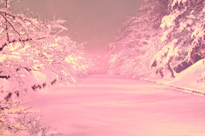 さくらの枝に積もった雪をライトアップ。まるで満開のさくらが咲いているように見える幻想的な光景をお楽しみください。