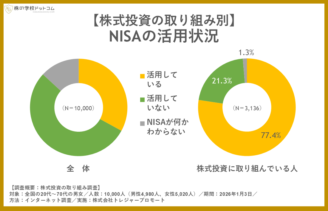オンライン株式スクール「株の学校ドットコム」(運営会社:株式会社トレジャープロモート、東京都千代田区、代表取締役社長:瀬川 丈)は、全国の20代~70代の1万人を対象に「NISAの利用状況」についてアンケート調査を行いました。