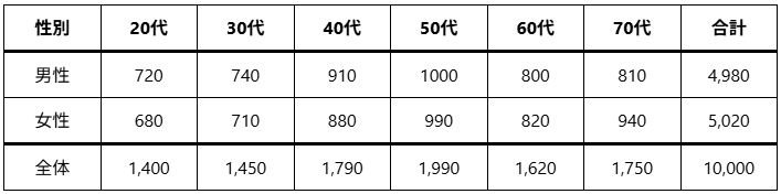 調査人数:10,000人(男性4,980人、女性5,020人。年代別の内訳は以下のとおり)
