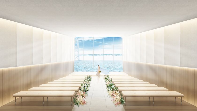 光を柔らかく反射する壁と天井。正面に広がる景色を最大限に生かし、景色と想いが重なり合う、神秘的で心に深く残る誓いの空間へと生まれ変わります。