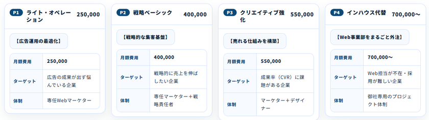 ●P4:インハウス代替(月額700,000円~) Web事業部を丸ごと外注。戦略から実行まで全領域をカバー。
