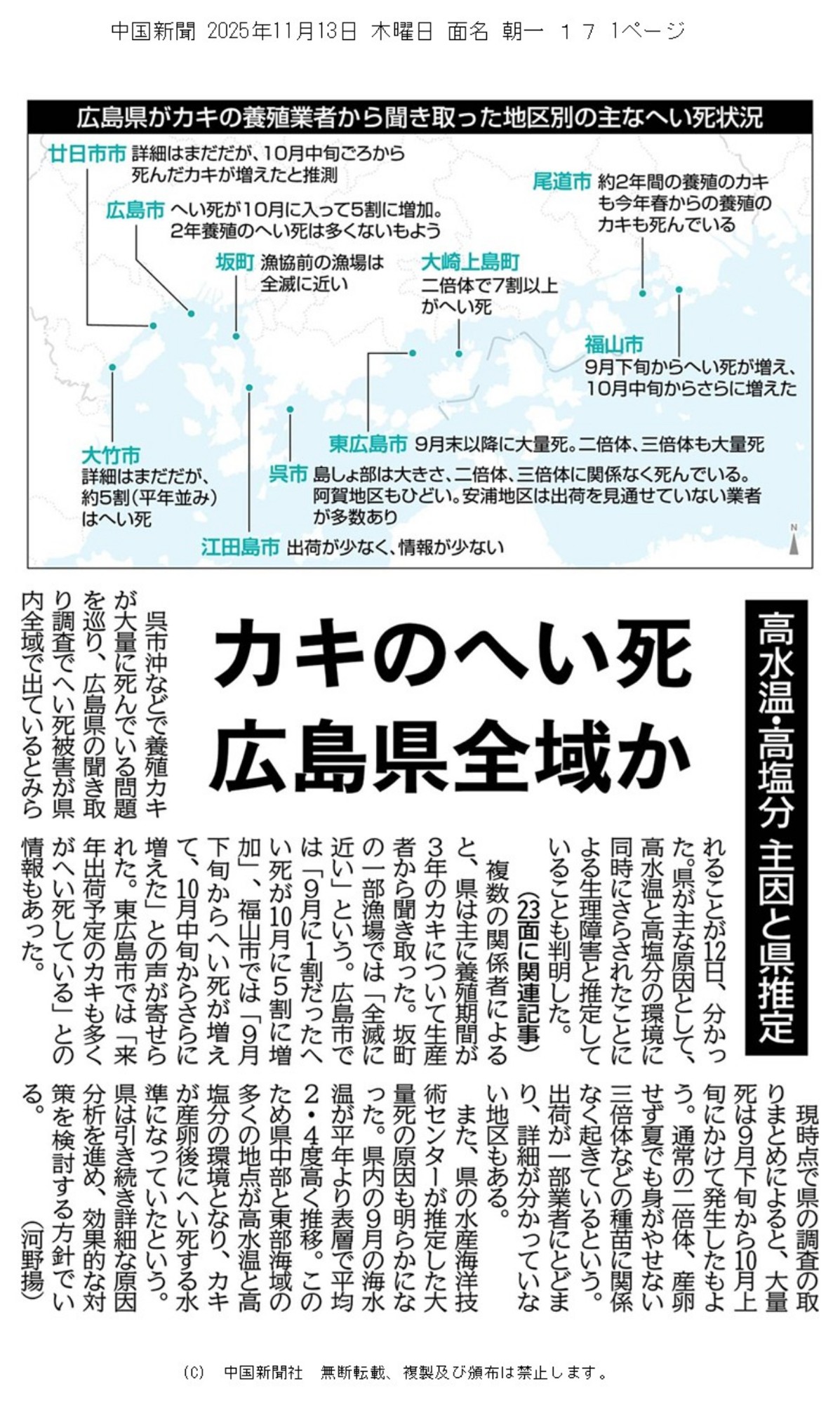 広島県は全国シェア60%以上を占める日本最大の牡蠣養殖産地です。2025年10月20日からの出荷開始時期に合わせて水揚げを開始したところ、呉市から東広島市を中心とした地域で大量のへい死が確認され、江田島市や廿日市市など西側の地域にも影響が広がり、広島県全域で5~9割の牡蠣に被害が出ています。