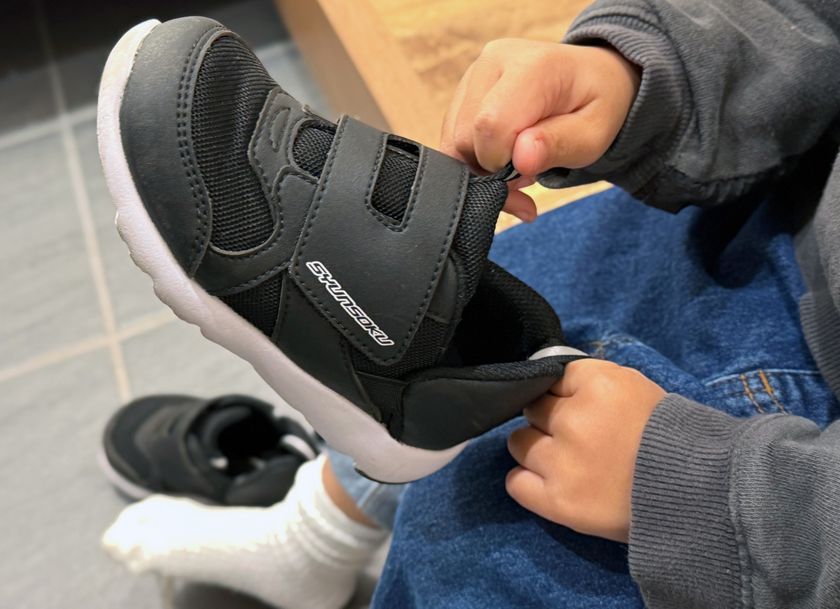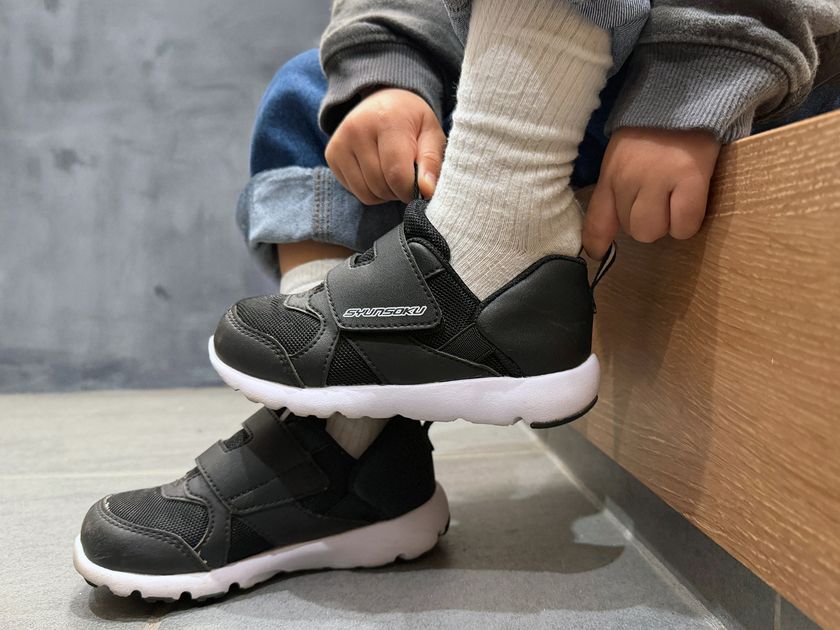 幼児が靴を脱ぎ履きする際、多くは座った状態で行うことに着目。靴のかかと部分が“パカっ”と開くスリット構造を取り入れることで、足入れのしやすさを向上させました。さらに、両サイドに耐久性のあるフィッティング調整ゴムを採用し、かかとに靴がしっかりフィット。靴と足の隙間を減らしホールド感を高め、安定した歩行をサポートします。また、シュータン(砂除け)を巻き込まないよう外側を固定し、内側のみを開放。内側にはツマミを設け、簡単に引っ張れる工夫も施しています。