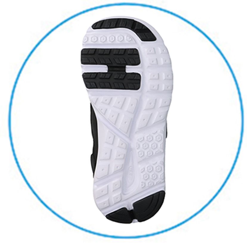 内側を深く、外側を浅く設計した屈曲溝が特徴のアウトソール。子どもの足の動きに
