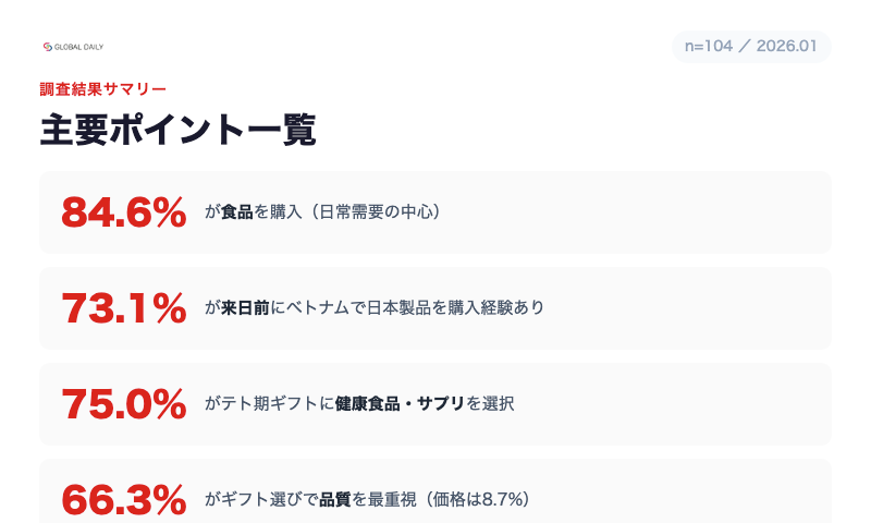 在留ベトナム人は「旅行者」ではなく、日々の生活を回す“生活者”であるため、購買の中心は日常的に消費する食品・日用品に集まります。一方で、化粧品やサプリメントも半数超となっており、美容・健康領域は日常需要とギフト需要の双方で存在感が大きいことが分かりました。