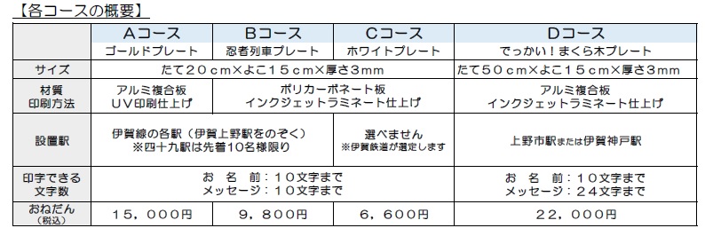 伊賀鉄道をご支援いただけるオーナー様を募集し、お名前やメッセージを記載したプレートを、伊賀上野駅以外の伊賀線各駅構内(四十九駅は先着10名様限り)のまくら木に設置します。