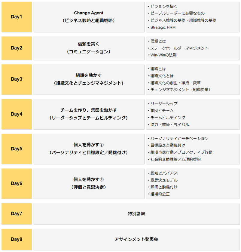 8講座構成となっており、ピープルマネジメントの原理原則並びに組織変革の全体像とプロセスを理解し、集団、個人の理解を深め、受講生同士での議論により具体的なアクションプランを設計していきます。