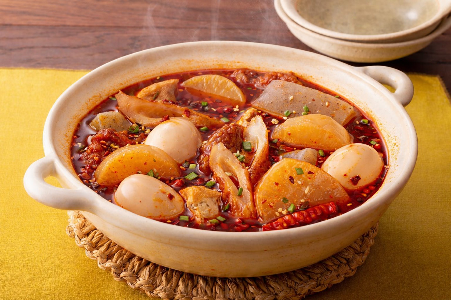 麻辣湯ベースのスープでおでんの具材を煮込みました。