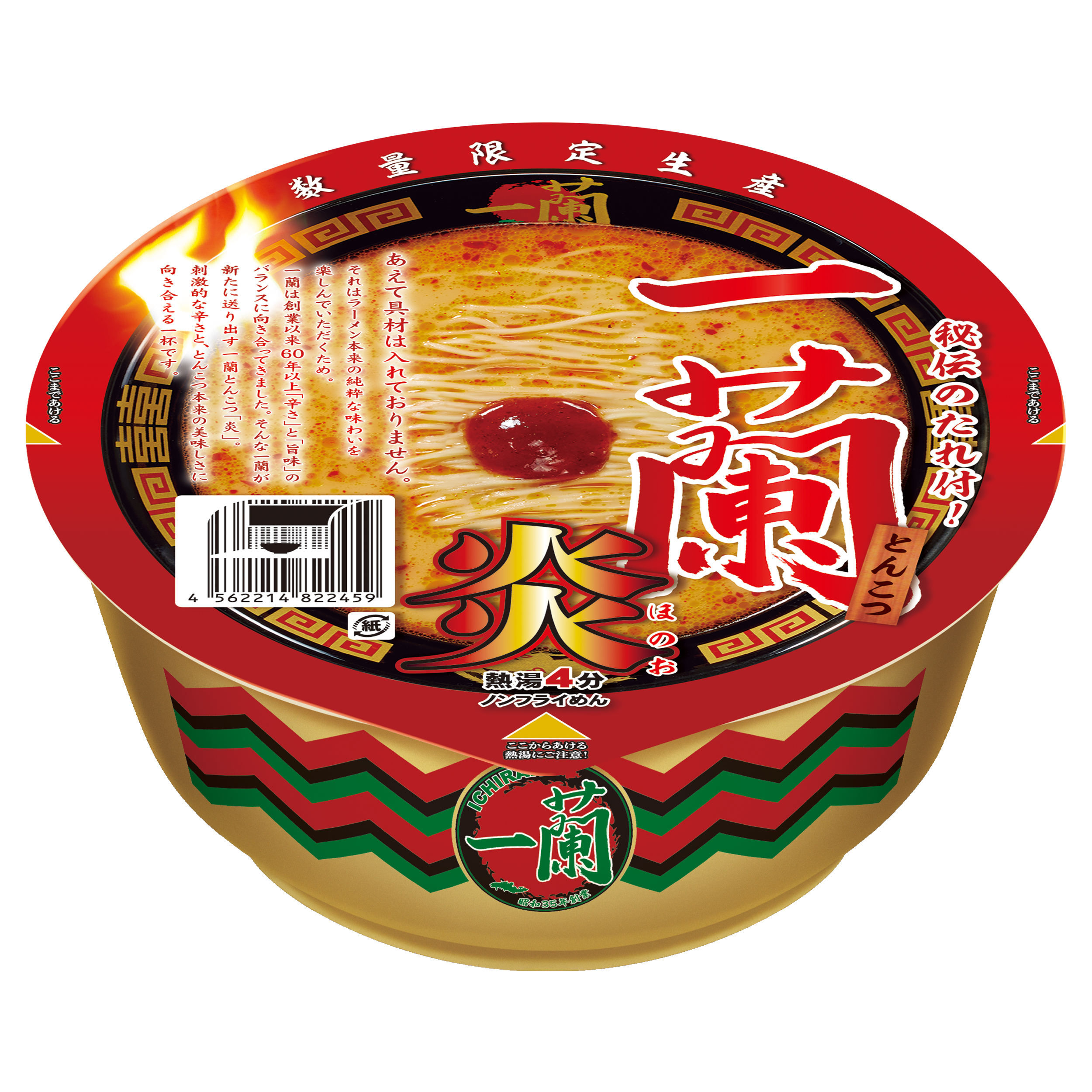 2026年2月5日より、一蘭は2024年に数量限定で発売したカップ麺「一蘭とんこつ炎」を再販いたします。シリーズ累計の総出荷数1700万食を超える「一蘭とんこつ」カップ麺の一つとして、旨辛スープと風味豊かな細麺、一蘭の代名詞「秘伝のたれ」が絶妙に調和した一杯をお届けします。具材をあえて入れず、ラーメン本来の純粋な味わいを楽しんでいただけるように設計されたこの商品は、麺・スープ・秘伝のたれが織りなす刺激的な辛さと美味しさに向き合えるカップ麺です。国内一蘭全店舗や公式通販、一部小売店にてお求めいただけます。手軽にラーメンの奥深さを味わえる贅沢な一杯です。ぜひ、一蘭の職人技が詰まった「一蘭とんこつ炎」をご堪能ください。