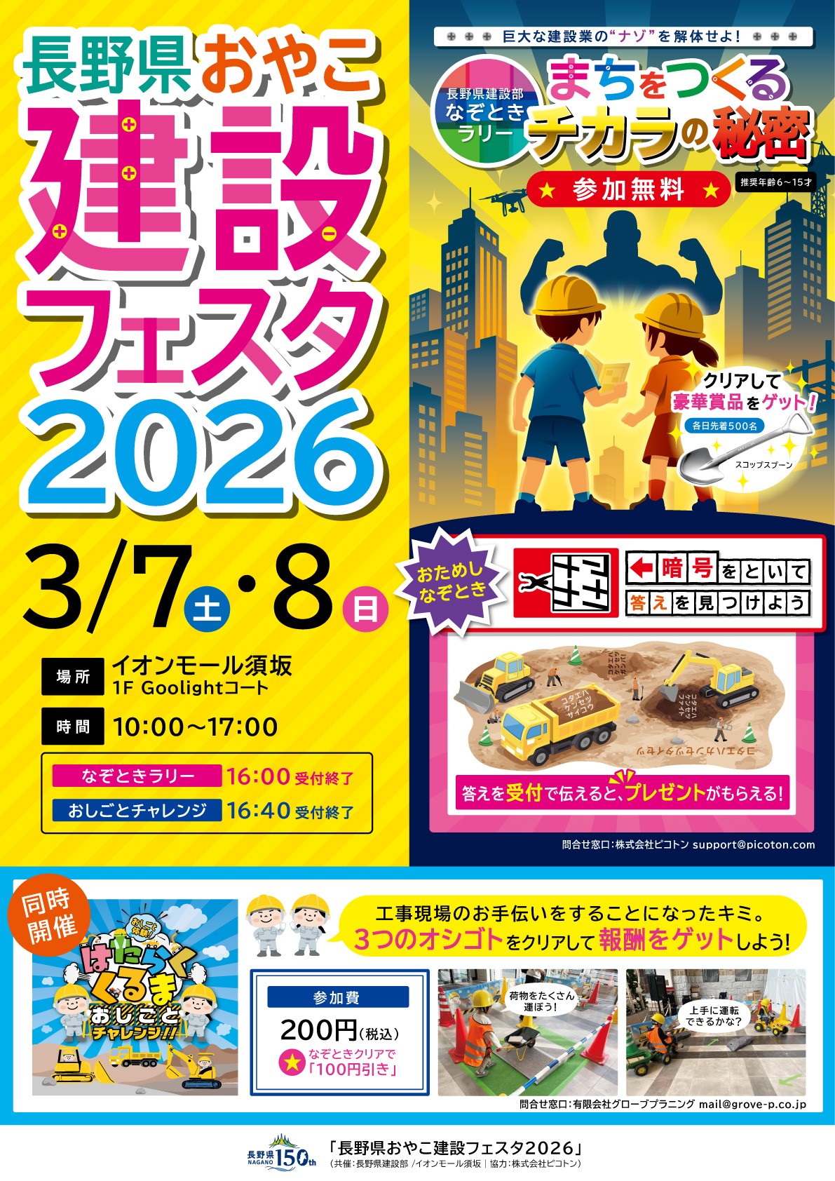 2026年3月7日(土)・8日(日)の2日間、イオンモール須坂(〒382-8501 長野県須坂市大字福島386番地1)にて、「建設」をテーマにした親子向け体験型イベント「長野県おやこ建設フェスタ2026」を開催します。(共催:長野県建設部/イオンモール須坂、協力:株式会社ピコトン)