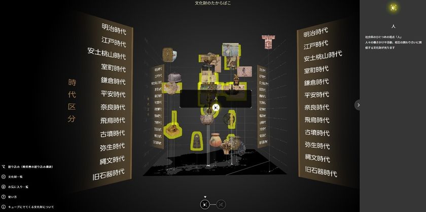 本コンテンツでは、3D空間の側面に4つのテーマ、「人」、「モノ」、「こと」、「どこから?」を設定しています。例えば、テーマ「人」では、人の形を表した古墳時代の武人埴輪や平安時代の平治の乱を描いた「平治物語絵巻」というように、人の造形や人々の活動・関係性を表した文化財が光ります。