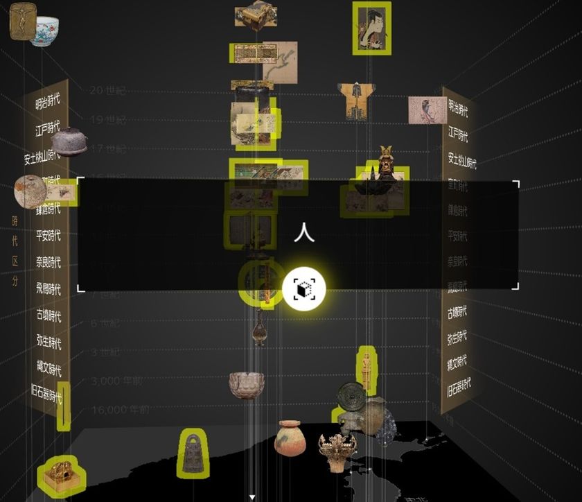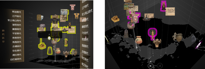 立体的な3D空間の中に、文化財が配置されています。3D空間の縦軸には年代、底面には日本地図を置くことで、文化財の年代や出土した場所、描かれているモチーフや制作に関連する場所など、文化財相互の関係性を視覚的に把握することができます。