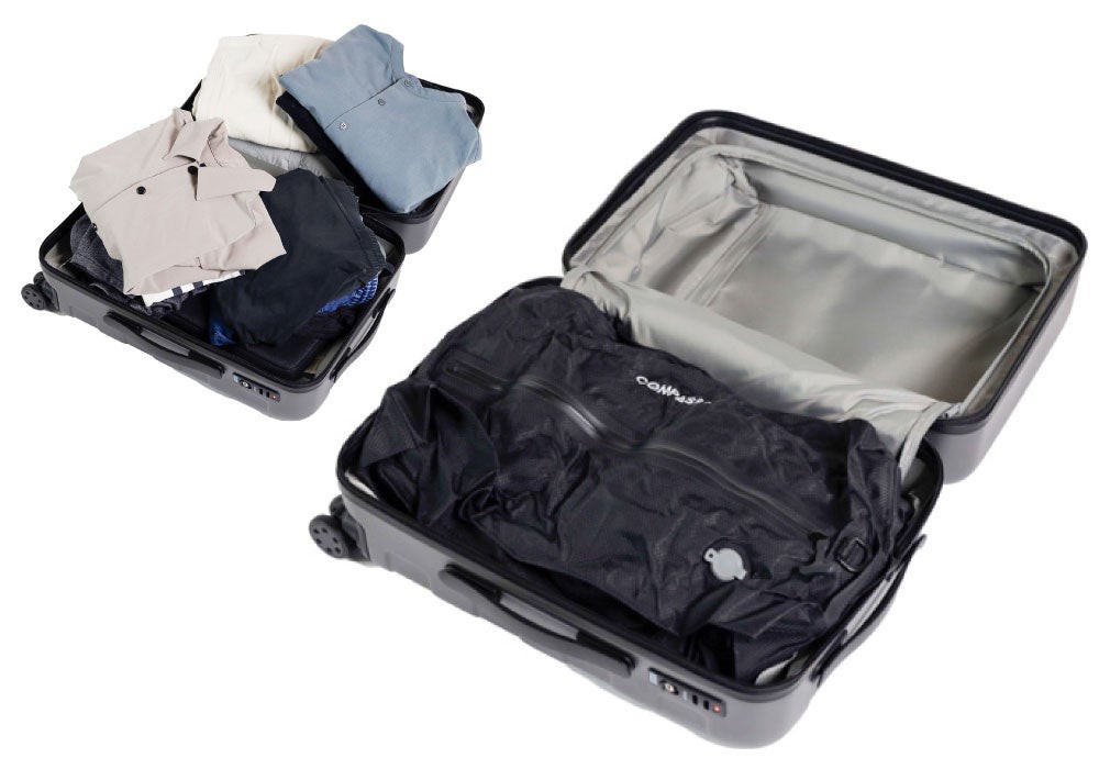 約3日分の荷物が入る大容量。パンパンに膨らんだバッグも、スーツケースの半分のサイズまで圧縮。(一般的な36Lスーツケースの半面に収まる設計)口が広いため、畳んだ衣類の出し入れにストレスがありません。