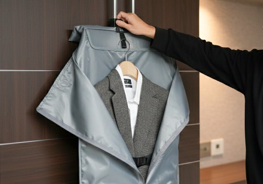 バッグを広げた状態でスーツをセットし、そのまま畳まず、包み込むようにバッグを形成。スーツを折り畳む必要がないため、目的地に到着してすぐに、アイロンいらずの綺麗な状態で着用可能です。