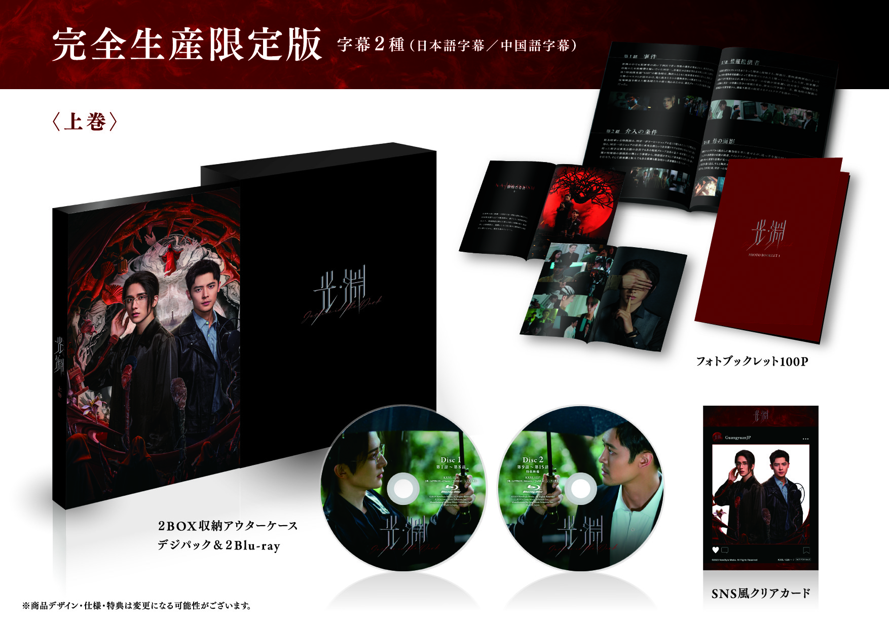 本商品には、メイキングやMVなどを含む特典映像を上巻に約35分、下巻に約45分収録予定。封入特典として、上巻には2BOX収納アウターケース、フォトブックレット100P、SNS風クリアカードを、下巻にはフォトブックレット100P、インスタントフォト風カード2枚を付属いたします。