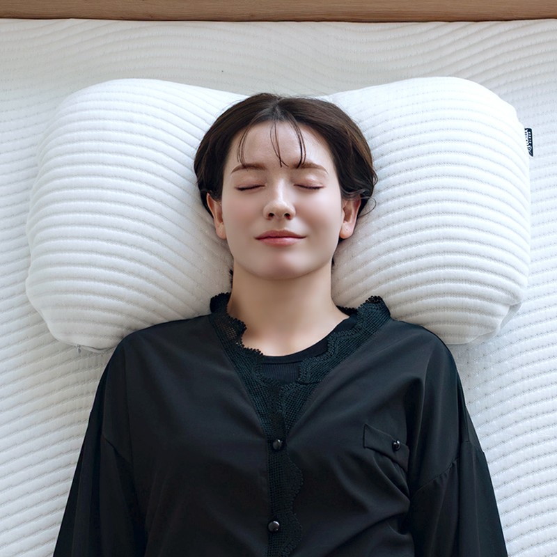 首と肩のラインに沿う、人間工学に基づいた独自カーブが首元に心地よくフィット。サイドを高めた立体構造により、仰向け・横向きどちらの姿勢でも頭部をしなやかに安定させます。