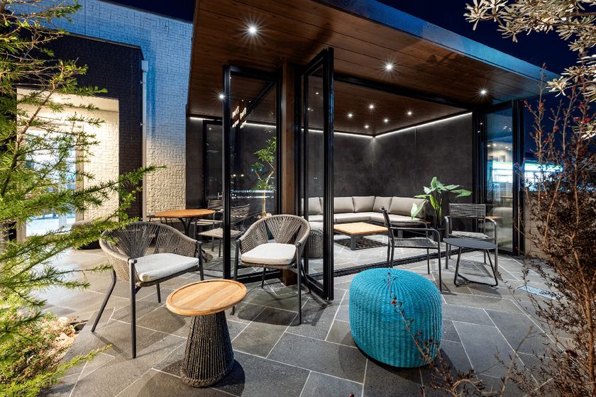 床材には1954年設立の建築資材のプロフェッショナル企業である株式会社エービーシー商会のインポート・セラミックタイルを使用。ダイナミックな石材と大理石の洗練さを兼ね備えた仕上がりで、Kayu styleのリゾート系家具とマッチし、洗練されたリゾート空間を演出します。また機能性にも優れ、滑らかな表面にも関わらず、骨材の効果で滑りにくく、防滑性と清掃性の両方の機能を兼ね備えており、屋外にも対応。