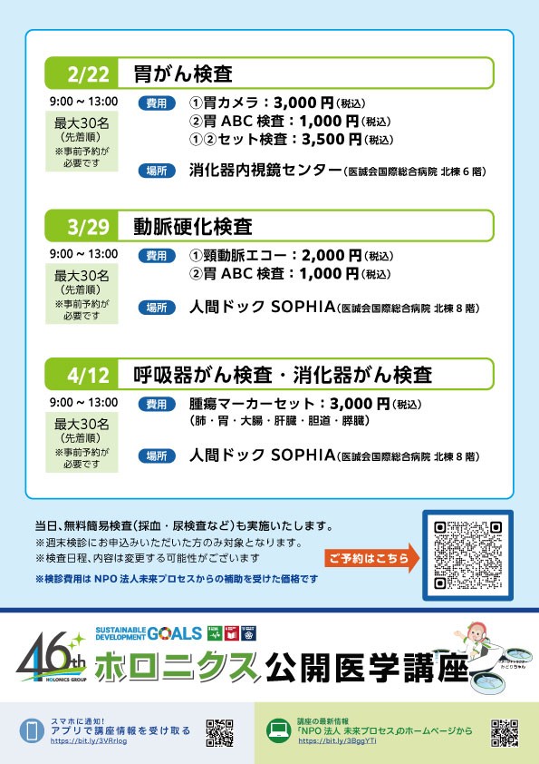 医療法人医誠会 医誠会国際総合病院(大阪府大阪市、代表者:谷 幸治)は、NPO未来プロセスが主催する「週末検診」に協力しており、2月22日(日)9:00~13:00 「胃がん検査」の事前予約を開始しました。本イベントは、公開医学講座とあわせた医療啓発活動の一環として実施するもので、週末受診、NPOの費用補助により、検診機会の拡大を目的としています。
