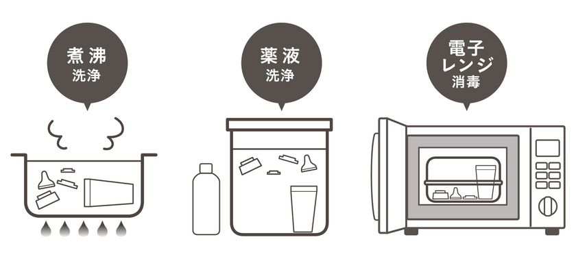哺乳瓶はいつでも清潔に保ちたいもの。煮沸洗浄・薬液洗浄・電子レンジ洗浄の3つの方法に対応しており、ライフスタイルやシチュエーションに合わせたお手入れが可能です。
