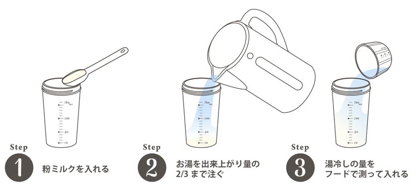 コップとフードにメモリがついています。ミルクを溶かすときは、コップのメモリで出来上がり量の2/3までお湯を注ぎます。その後、フードのメモリで湯冷しを追加すれば人肌のミルクが出来上がります。