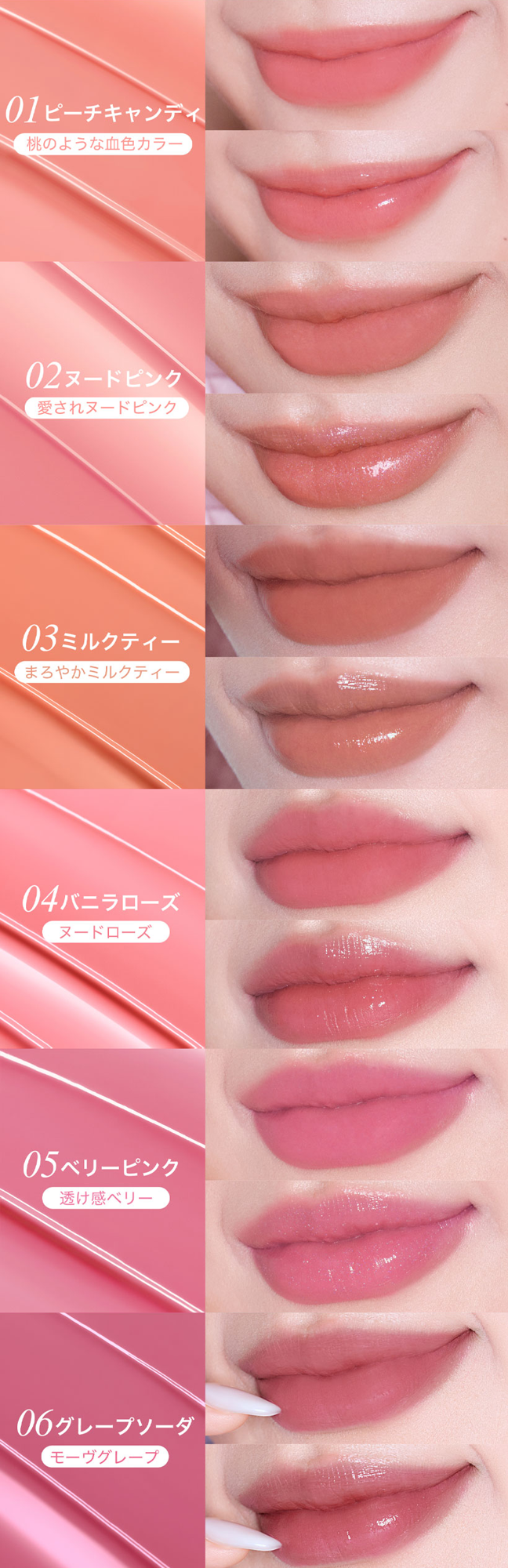 - 色展開:01 ピーチキャンディ / 02 ヌードピンク / 03 ミルクティー / 04 バニラローズ / 05 ベリーピンク / 06 グレープソーダ- 発売日:2026年2月17日