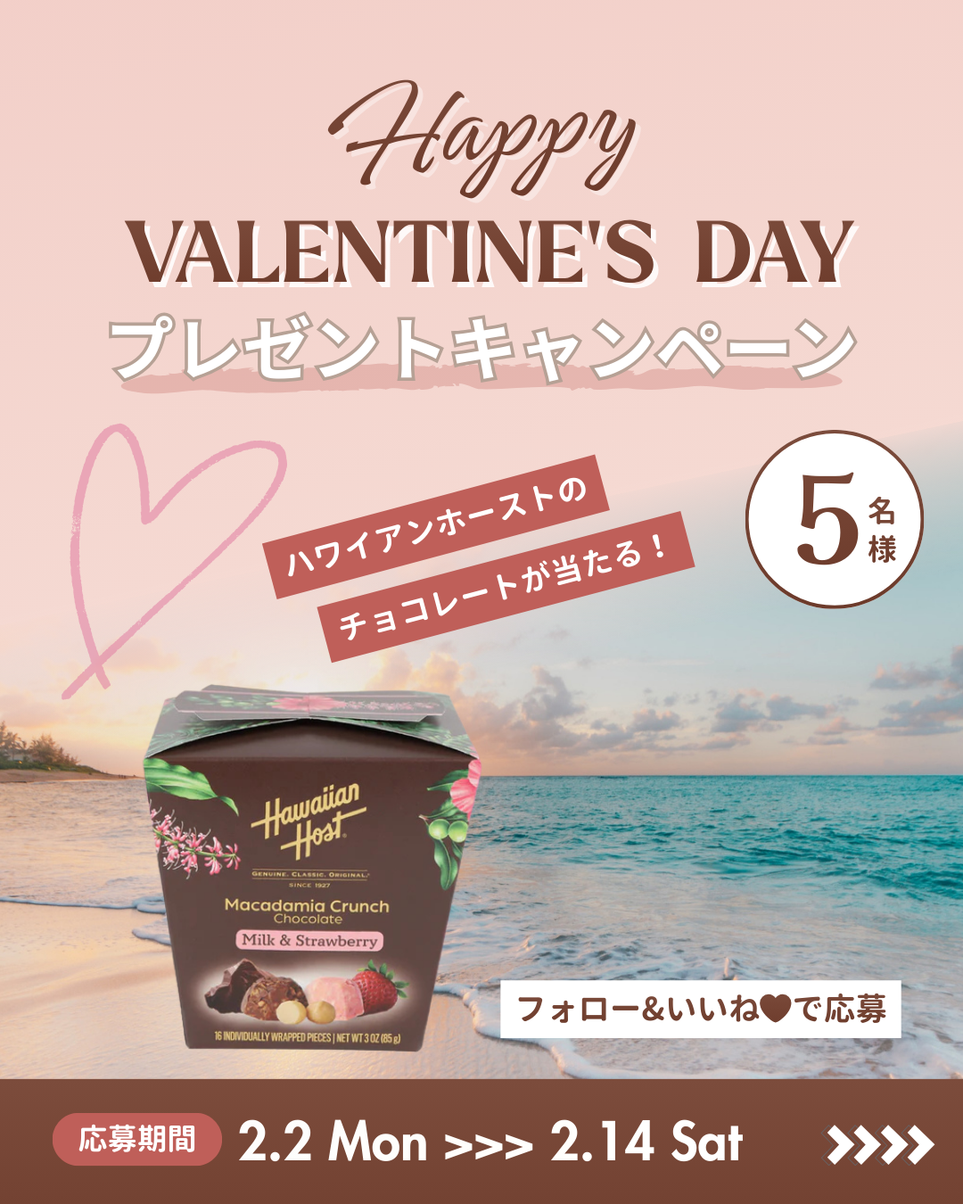 ハワイ現地では、“Happy Valentine's day”に近い表現として、 “Hauʻoli Lā Aloha”(ハウオリ ラ アロハ)というハワイ語が使われています。愛を意味するアロハが溢れる、ハワイならではのバレンタインデーをお楽しみください。