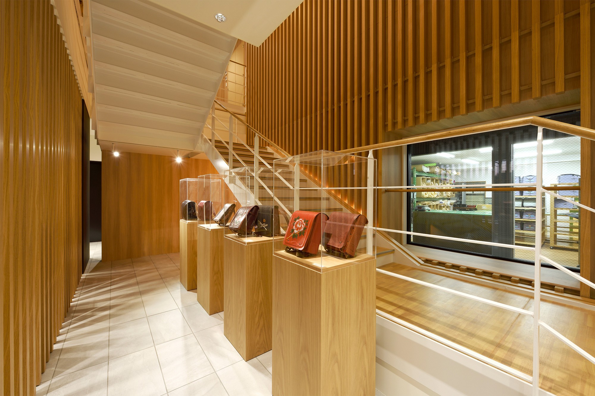 名古屋本店1階では「ランドセルミュージアム」を併設し、受賞作品や昔のランドセルを通して、ランドセルの進化と同社のものづくりの歩みを体感できます。2階に上がる階段からは工房の一部を覗き見ることもできます。