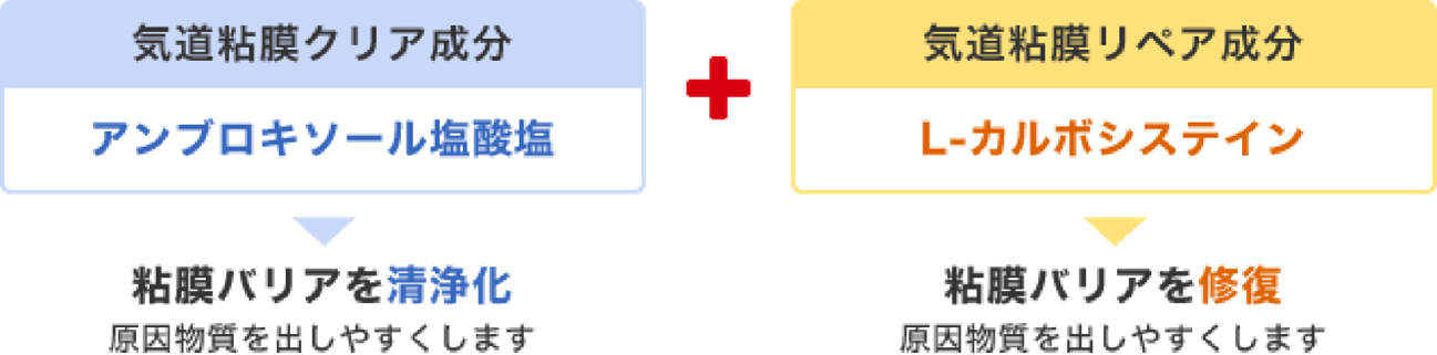 パブロンSゴールドWは、気道粘膜バリアを清浄化し、たんを出しやすくする、気道粘膜クリア成分の「アンブロキソール塩酸塩」と、気道粘膜バリアを修復し、正常な状態に近づける気道粘膜リペア成分の「L-カルボシステイン」を処方。かぜの原因物質を出しやすくして症状をやわらげます。