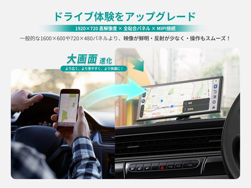 1920×720高解像度+MIPI接続で、スマホ画面の約3倍の情報量。ドライブ体験が劇的に変わる。