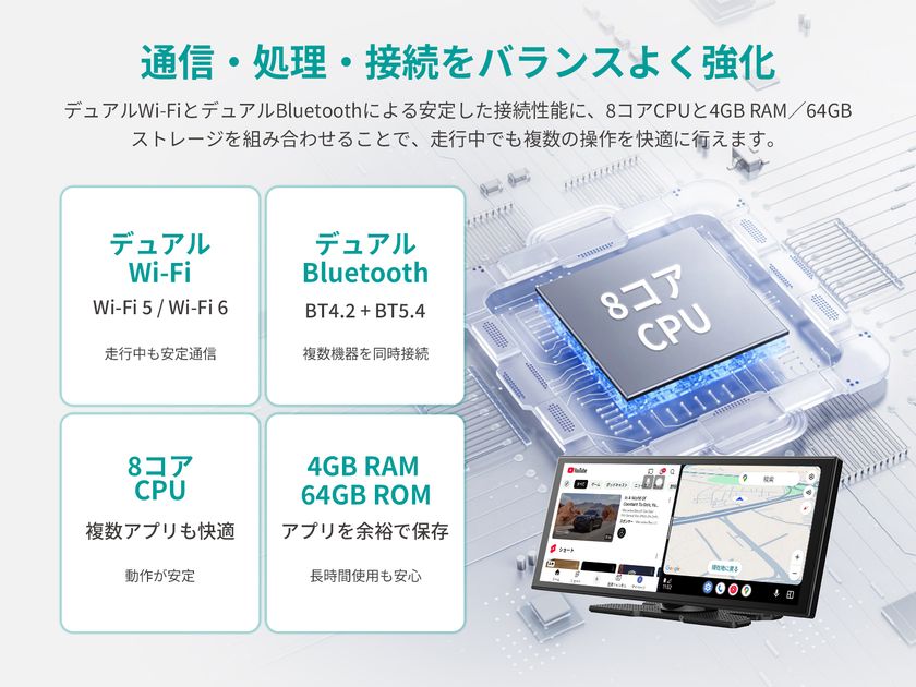 高性能8コアCPU + 4GBメモリ + 64GBストレージを搭載しているため、動画再生もナビ使用もサクサク快適。さらにmicroSDカード(最大256GB)にも対応し、お気に入りの映画や音楽をオフラインで楽しめます。