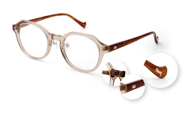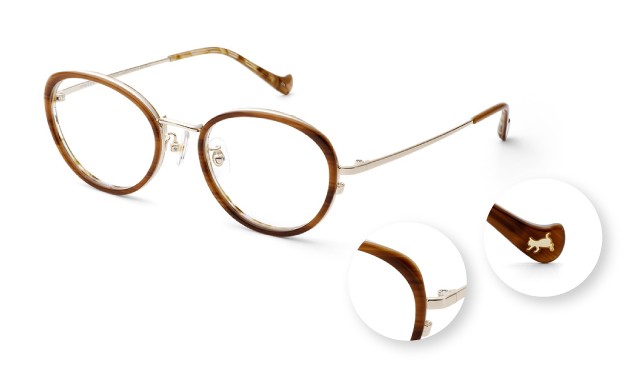 OHIGE:フロント部分に猫ひげをレーザーカットで施し、テンプルにはぷっくりした口元を表現したメタルパーツを埋め込みました。