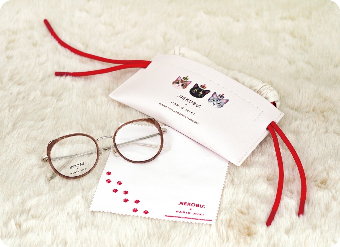 フレームにはケースとクロスが付属。ケースは冠を被った猫が並ぶオリジナルプリントを施し、内側は大切なメガネを守る巾着仕様に。猫がじゃれつく紐をイメージしたデザインになっています。