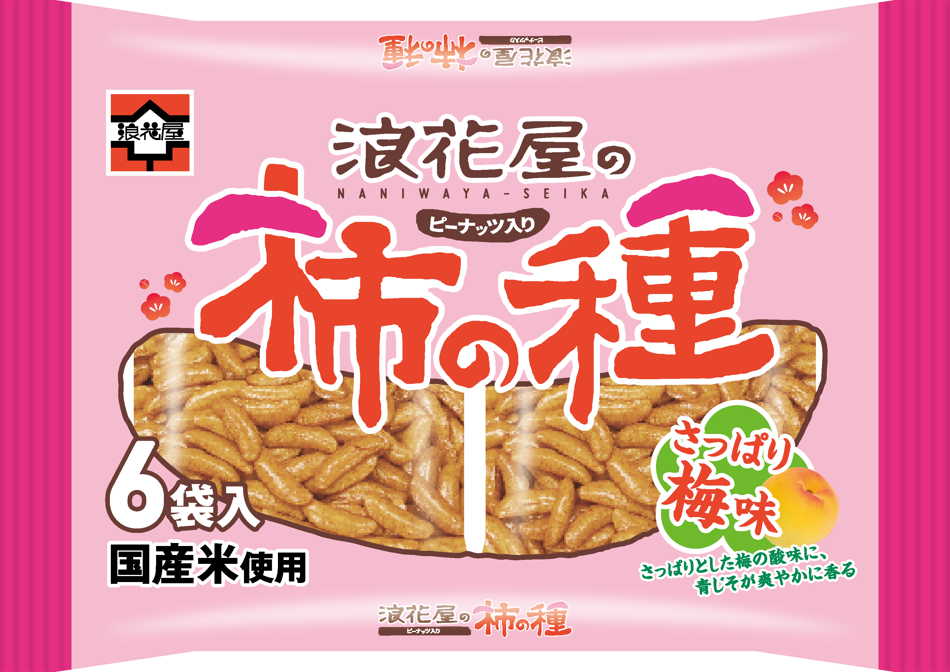 商品パッケージは、定番商品「浪花屋の柿の種ピーナッツ入り」のデザインをベースにピンクの華やかな配色で梅味であることが売り場でもひと目で伝わるように仕上げました。中身は個包装が6袋入っており、家族や友人、職場など、複数人で分けやすく、小腹がすいた時のおやつや、お酒のおつまみなど幅広いシーンでお楽しみいただけます。