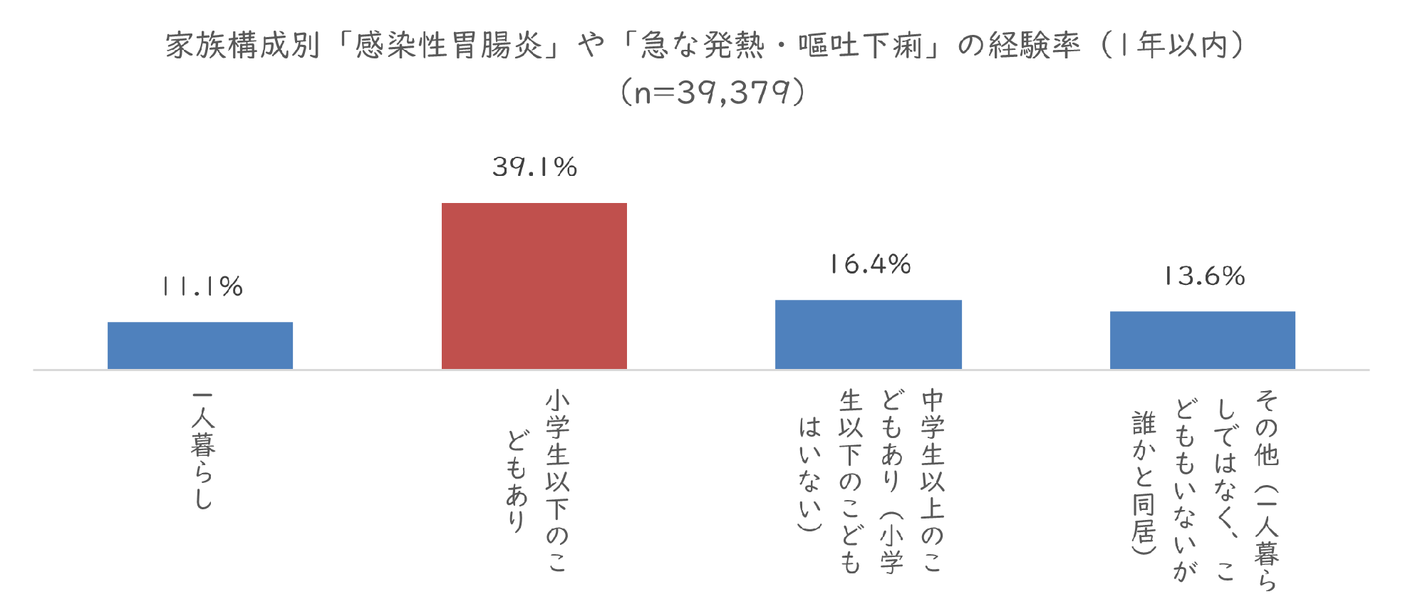 小学生以下のこどもがいる家庭は、1年以内の「感染性胃腸炎」や「急な発熱・嘔吐下痢」の経験率が高く、一人暮らしの家庭の約3.5倍、中学生以上のこどもがいる家庭の約2.4倍でした。