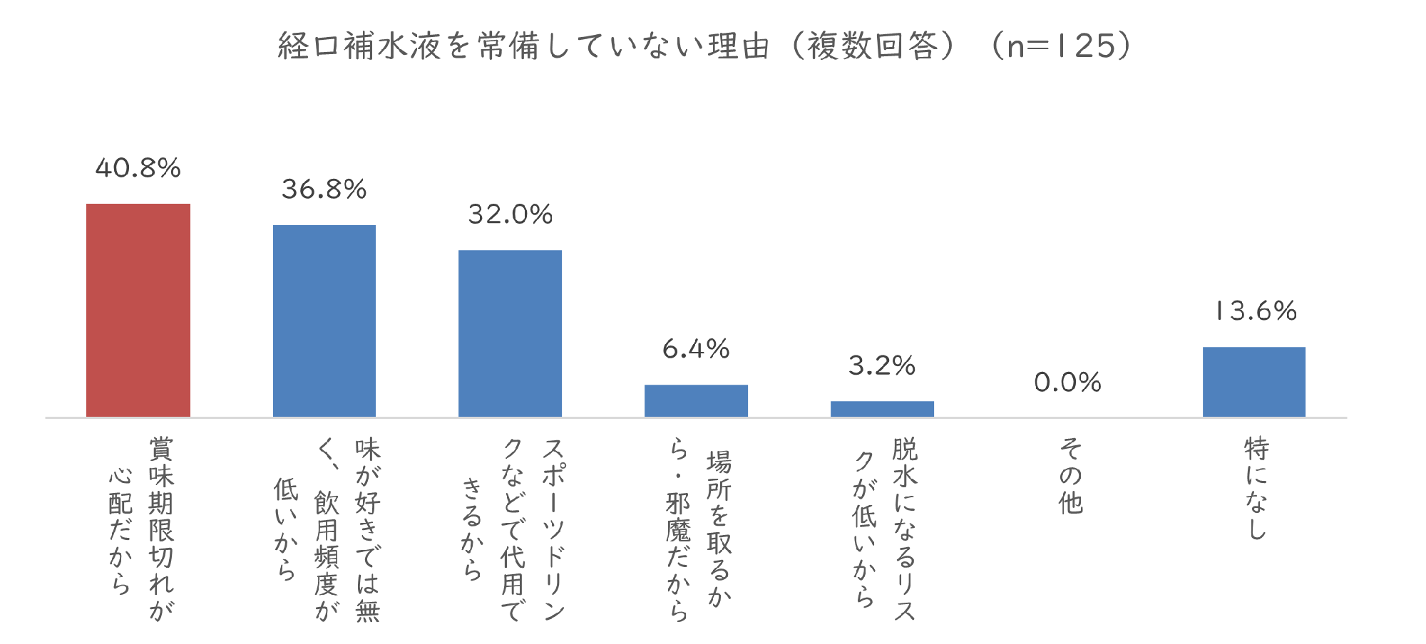 また、経口補水液を使わない主な理由は、「こどもが味を嫌がって飲んでくれない」や「家に常備していない」が多数でした。また、経口補水液を常備しない理由として「賞味期限の短さ」「味が好きではなく、飲用頻度が低い」などが上位に挙がりました。