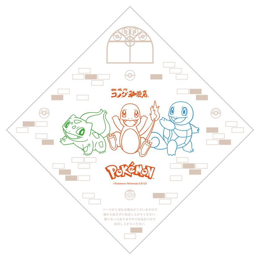 【コメダ珈琲店】フシギダネ・ヒトカゲ・ゼニガメのなかよし鶏タツタバーガーレモンタルタル バーガー袋