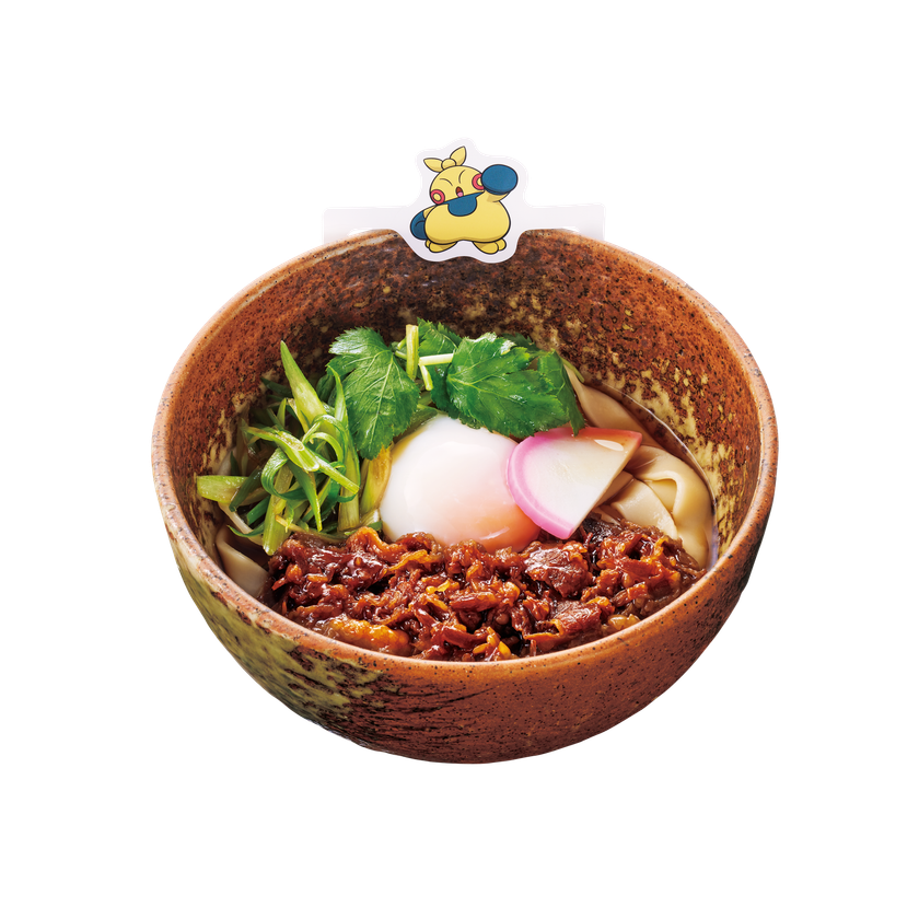 メタモンの色味を表現した、ふわふわ桜色のつみれとエビ入りのスープにつけて食べる一杯です。魚粉の旨みが効いたコクのあるスープに、つるっともちもちの麺を浸してすすれば、一口ごとにエビの香ばしい香りがふわりと広がります。ふわふわのつみれ、ぷりぷりのエビ、もちもちのきしめん。異なる食感が生み出すハーモニーをゆったりとご賞味ください。