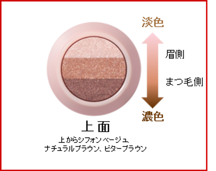 ・シフォンベージュ、ナチュラルブラウン、ビターブラウンの3色が1本になったスティックタイプのアイカラー。まぶたに沿って滑らせるだけで、1色1色塗り重ねたような繊細で美しいグラデーションのアイメイクが瞬時に完成します。チップやブラシなども不要で、誰でも簡単にご使用いただけます。