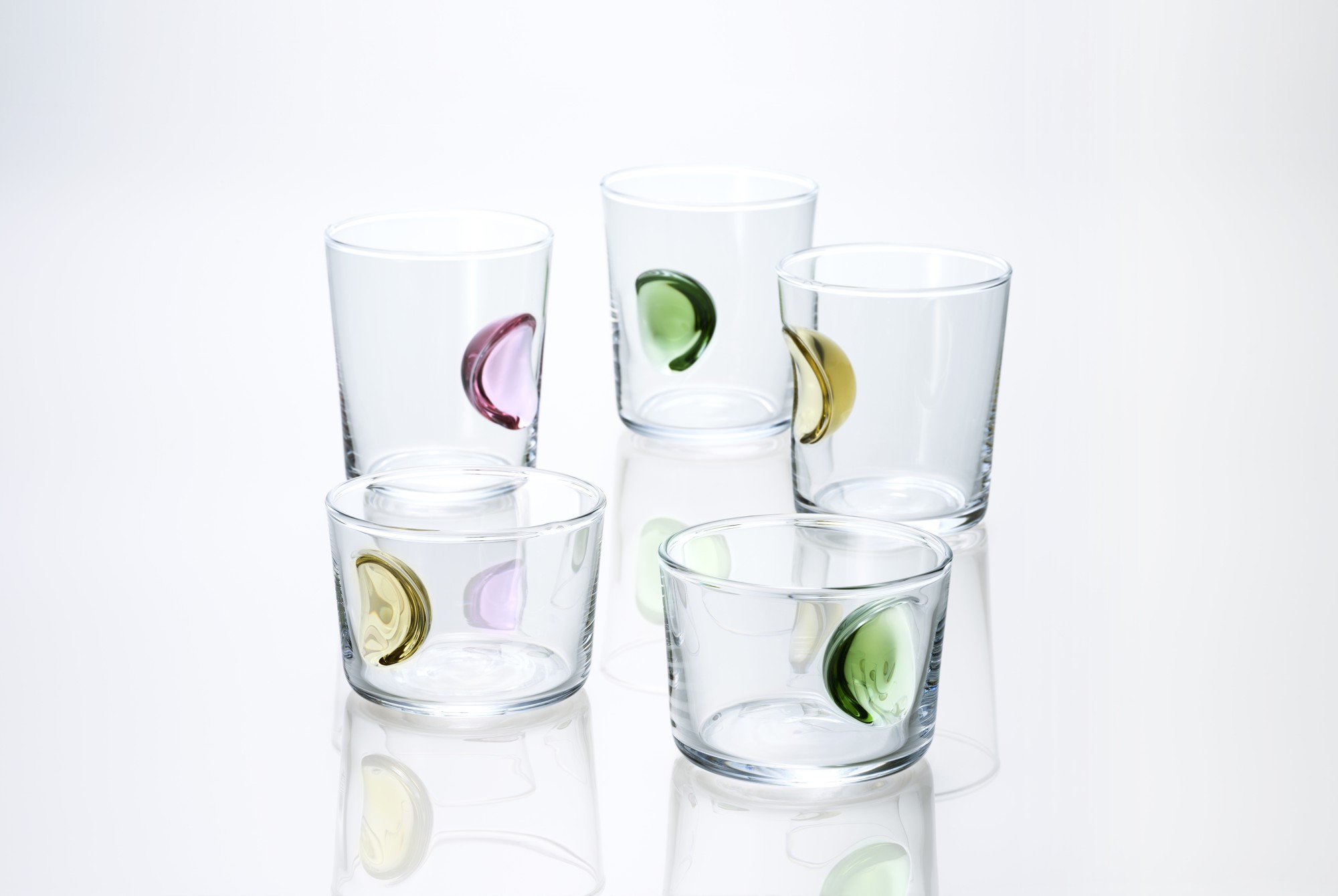 〈ekubo koppu えくぼコップ〉 手に取った時に、自然に触れたくなる明るい色のくぼみ。色ガラスをつけてあたためて吸うことでできたくぼみを「えくぼ」にたとえた愛らしいコップです。