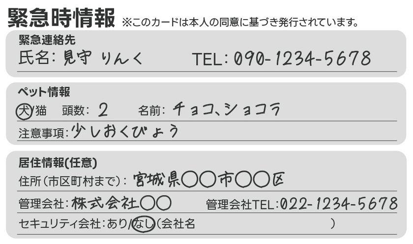 加入証明書はドナーカードのように財布などに入れて携帯できる形を想定しており、万が一倒れてしまった際にも周囲の方が気づき、ペットの存在が早期に共有されることを目的としています。