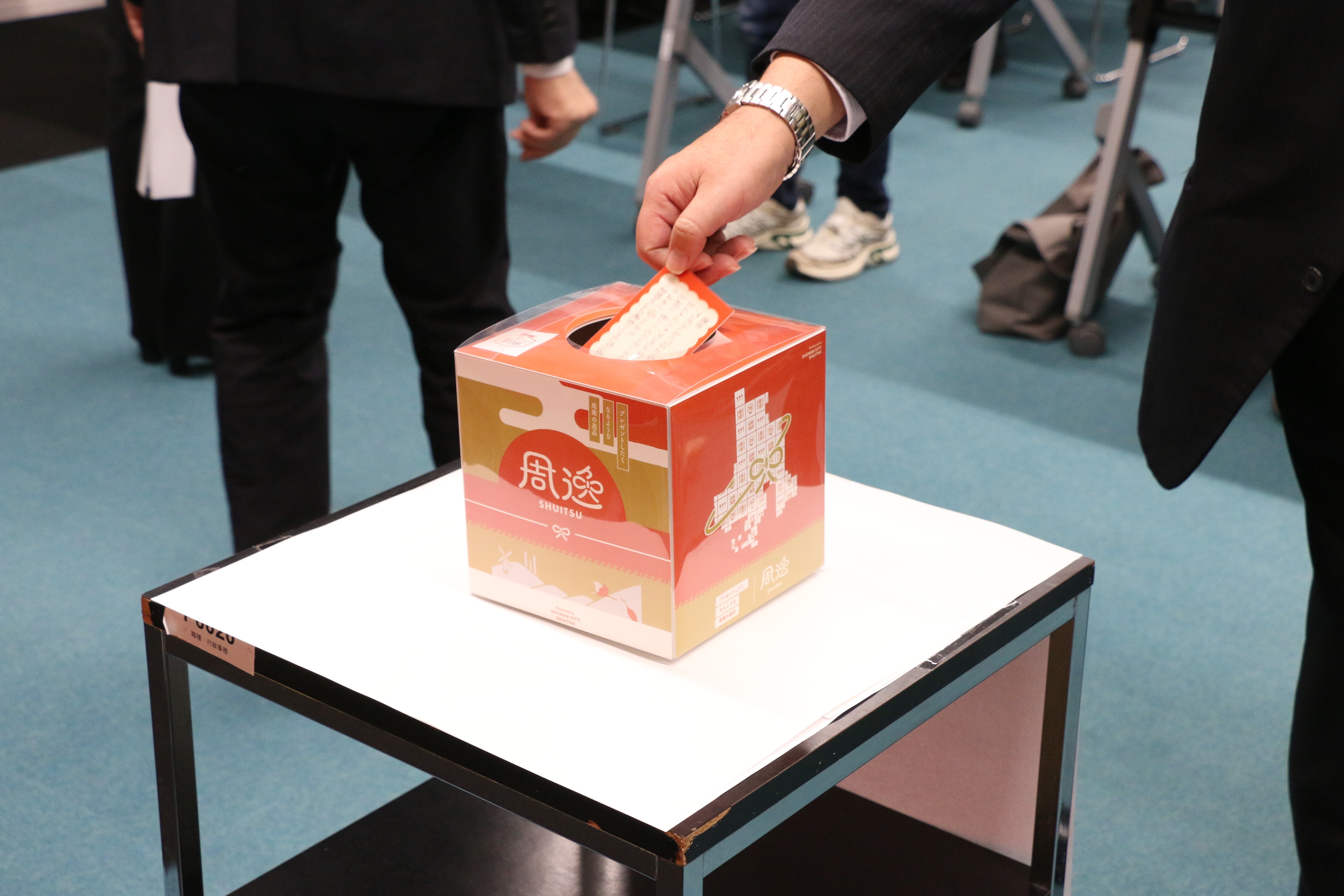 ハート形のパイに、周南の特産品「周防はも」のだしを塗って焼き上げ、みそを加えたホワイトチョコレートを挟んでいます。はもとみそのコラボ!なんとも斬新なアイデア。ハートの形や、外箱のパッケージのデザインも学生と一緒に考えました。まだまだ改良を重ね、1箱8個入(1,026円)で3月頃の販売を予定しています。