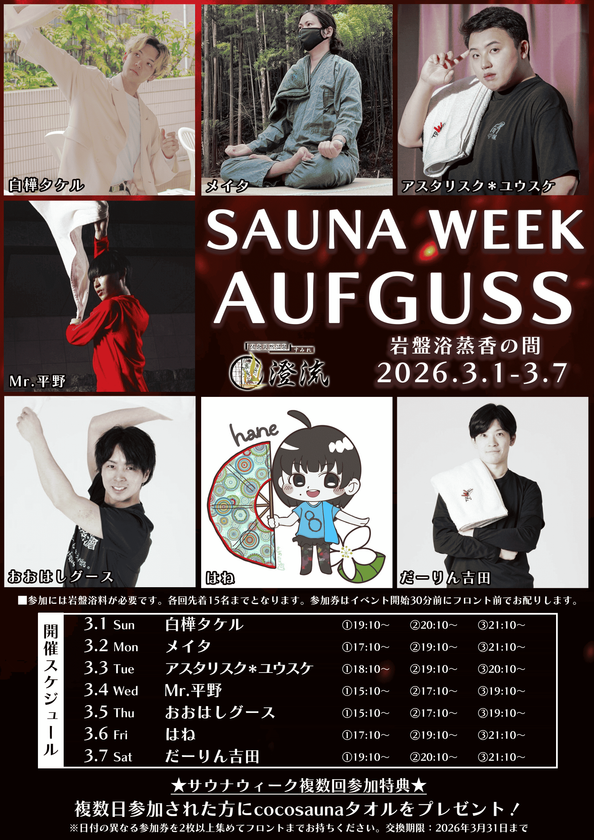イベントの目玉は数量限定で『漫画家タナカカツキ先生デザイン』のオリジナルタオルまたは澄流ロゴ入りサウナハットプレゼント。